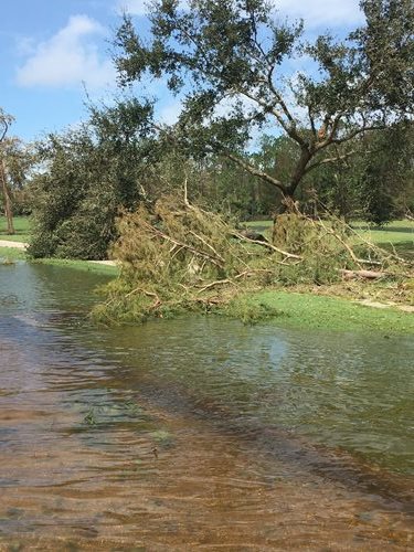 While being forever changed, the golf course once again holds the beauty each member became accustomed to.  Some changes noted areas follows: complete replacement of bunker sand, gold screenings in the waste areas, fresh pine straw, mulch and trees replaced in critical areas, sod installed where the trees were not needed to be replaced to allow for better playability, new fishtail palms and flowering trees were installed on number 11 and number 14 for screening.  Heavy equipment was used to remove the large root balls from overturned trees.  The bridge to number 11 was repaired and all heavy equipment trails leveled and sod installed.